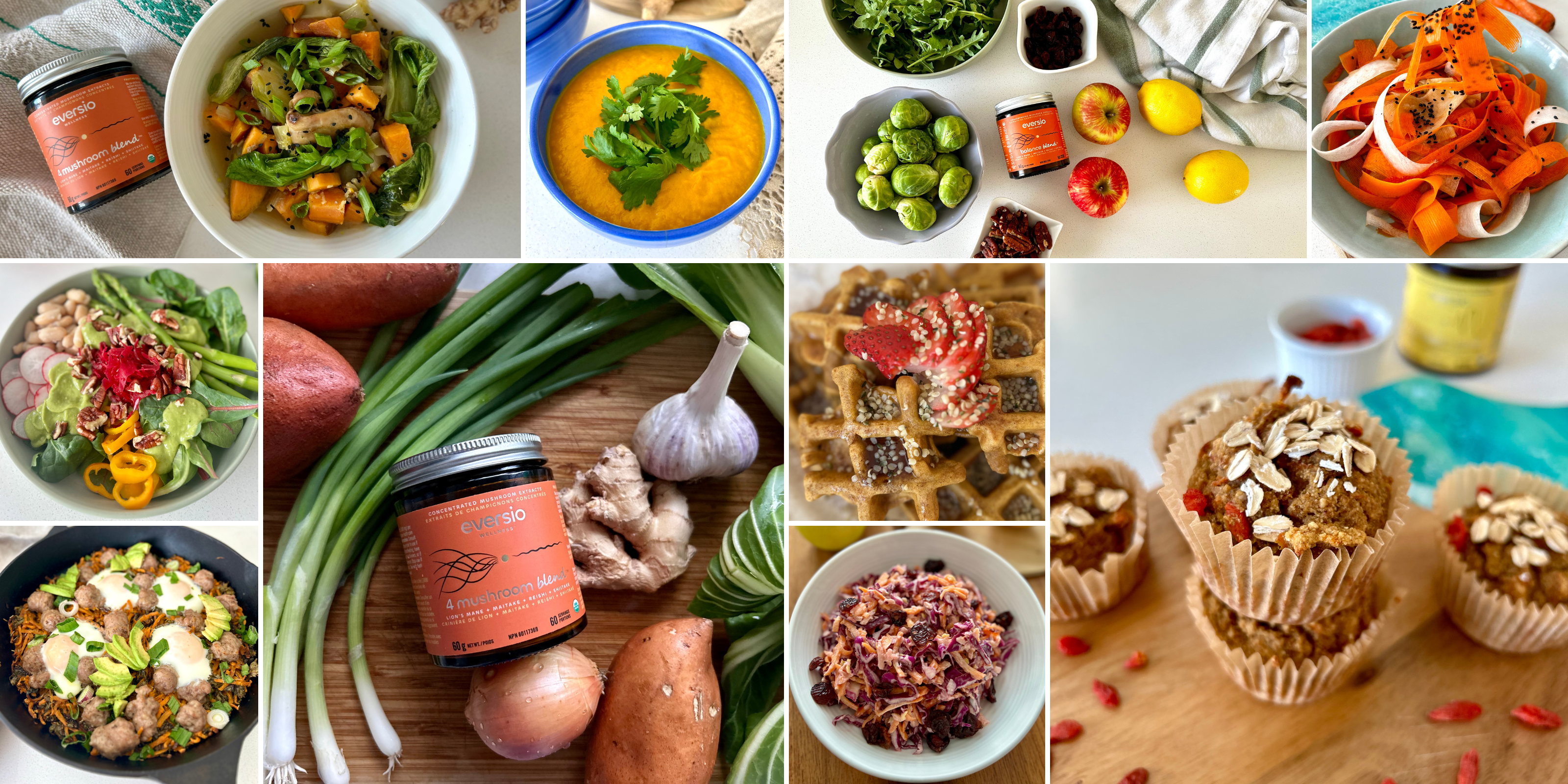 Kickstart your day with Spiced Sweet Potato Waffles—rich in vitamin A, fibre, and gut-friendly oat flour. Boosted with functional mushrooms like Lion’s Mane, Maitake, Shiitake, and Reishi, they support immunity, hormone balance, and mental clarity—all in one delicious bite.