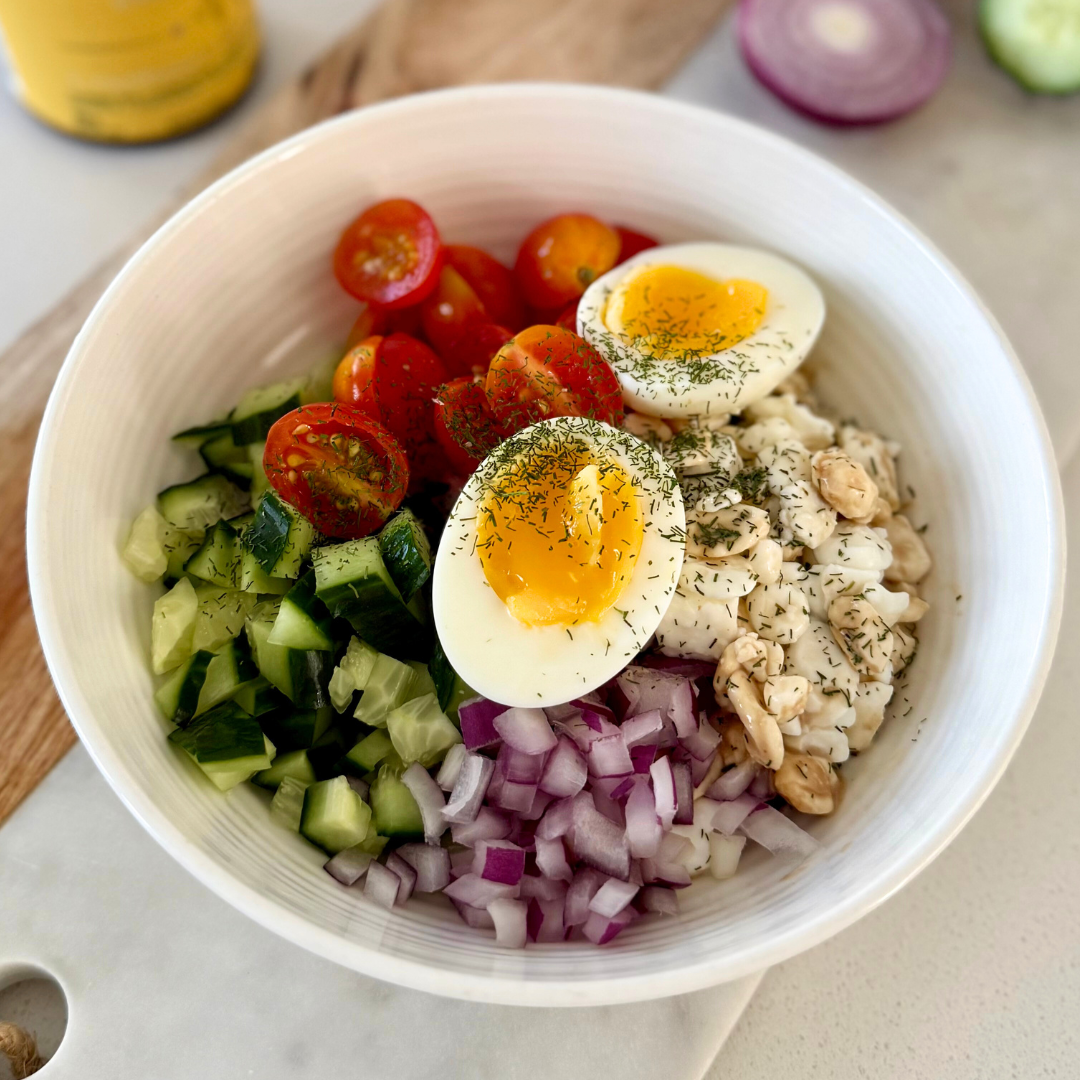 Fresh vegetables like cherry tomatoes, cucumbers, and red onions add crunch, colour, and antioxidants, helping reduce oxidative stress so your cells can produce energy more efficiently.