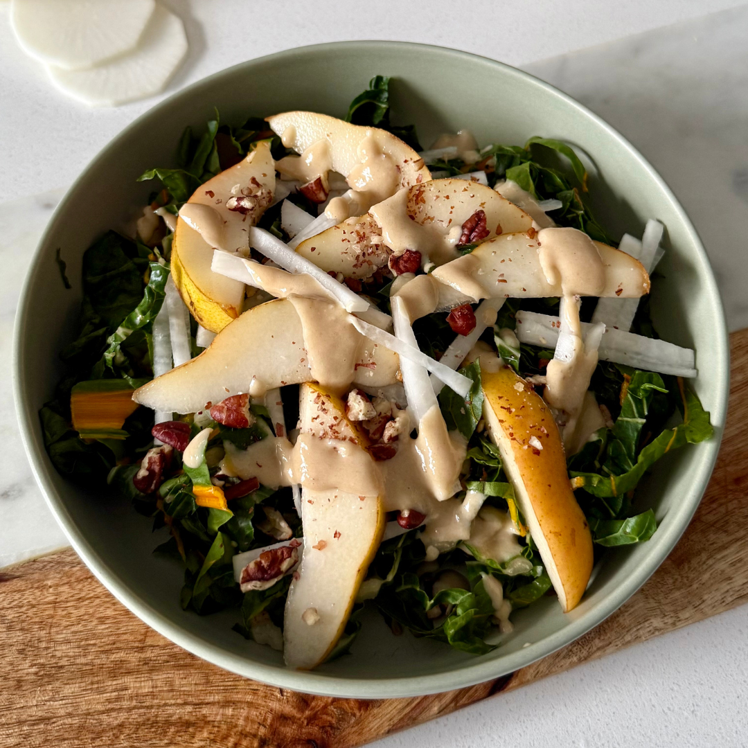 Assemble the Salad: In a large mixing bowl, combine the sliced Swiss chard, pear, daikon, and chopped pecans.