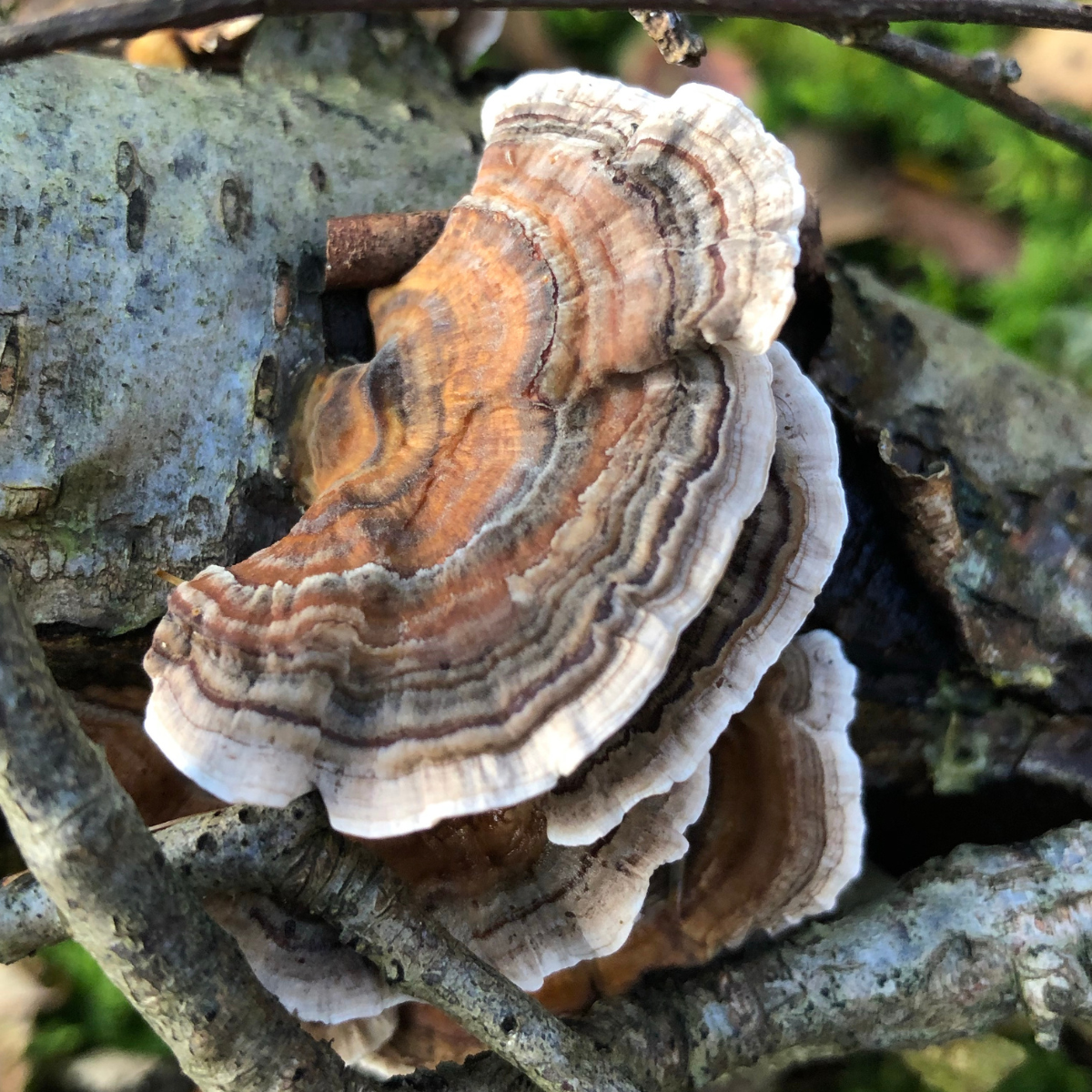 Turkey Tail mushrooms (Trametes versicolor) are a type of fungi that belong to the Polyporaceae family. They are widely distributed and can be found in forests around the world, growing on decaying logs, tree stumps, and branches. The name "Turkey Tail" comes from their unique appearance, as the fan-shaped caps of these mushrooms often display concentric rings of various colors that resemble the pattern of a turkey's tail feathers.