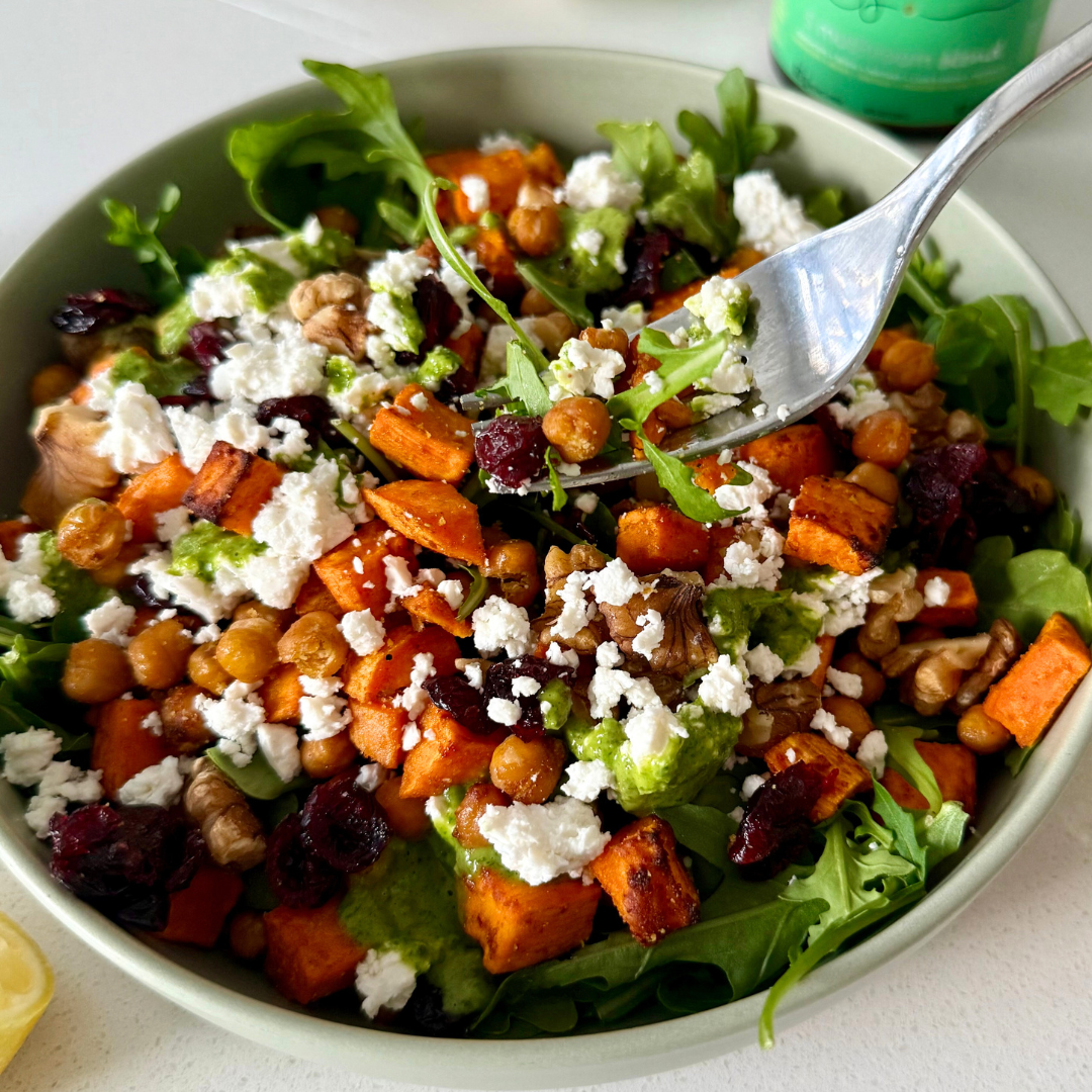 This salad combines peppery arugula, roasted sweet potatoes, and crispy chickpeas for a fibre-rich base that supports stable blood sugar and healthy digestion—especially important during perimenopause, when hormonal shifts can affect energy and metabolism. Sweet potatoes provide slow-burning carbohydrates and beta-carotene for skin and immune support, while chickpeas offer plant-based protein to keep you feeling satisfied and steady.