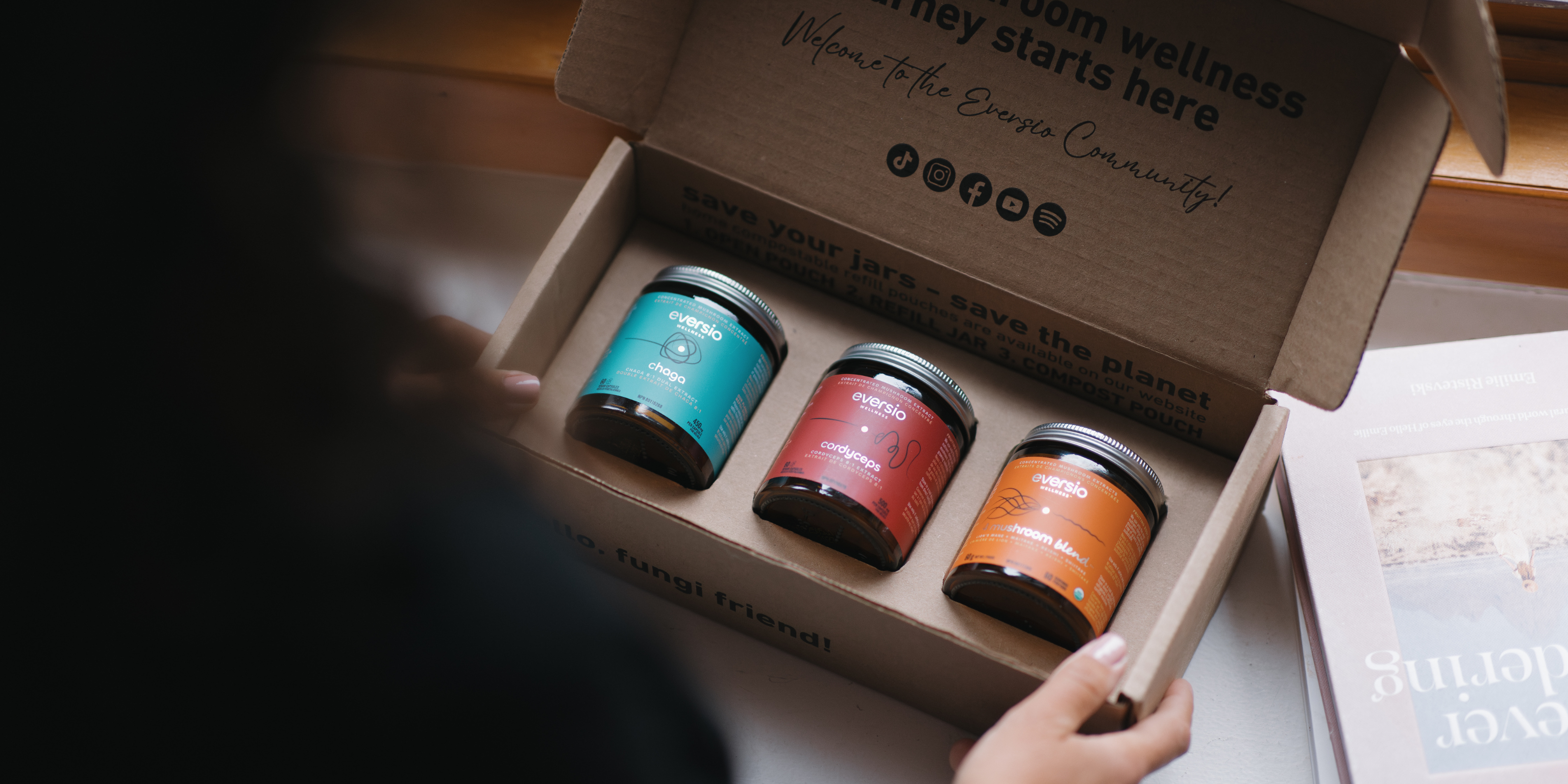 SAVE 10% When You Purchase This Custom Boxed Set - Includes 3 of our Premium Functional Mushroom Extract Products in Glass Jars (Cordyceps + Chaga + 4 Mushroom Blend) + FREE Mushroom Themed Journal and ½ TSP Mushroom Measuring Spoon